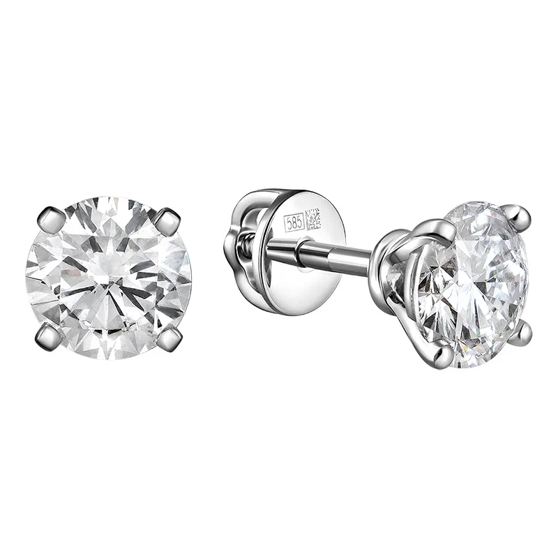 Серьги-пусеты из белого золота 585 пробы украшены выращенными бриллиантами круглой огранки 1.803 ct с характеристиками цвета D-F и чистоты VS.