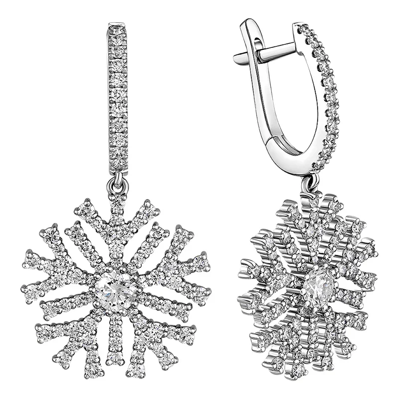 В самом сердце каждой снежинки, словно застывшая капля зимнего утра, сверкает центральный бриллиант. Его безупречная огранка идеально отражает свет, создавая завораживающую игру бликов. Вокруг центрального камня, подобно ледяным кристаллам, рассыпаны десятки мелких бриллиантов, образующих сложный и ажурный узор.