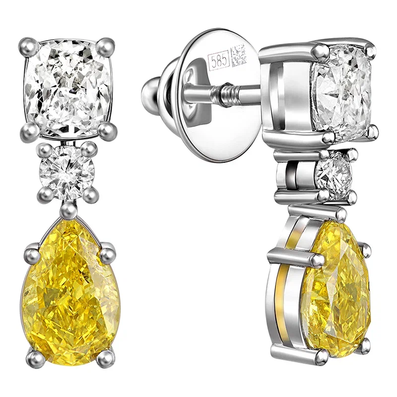 Серьги украшены выращенными бриллиантами огранки "Груша" желтого цвета 1.442 ct с характеристиками цвета Fancy Vivid Yellow и чистоты VS. Подчеркивают глубину цвета сияние бриллиантов огранки "Кушон" размером 1,010 ct /цвет D-F, чистота VVS-VS/ и изящные круглые бриллианты размером 0.125 ct /цвет EFG, чистота VVS-VS/