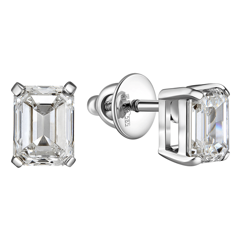 Серьги-пусеты из белого золота 585 пробы украшены выращенными бриллиантами изумрудной огранки 1.610 ct с характеристиками цвета E-F и чистоты VVS-VS.